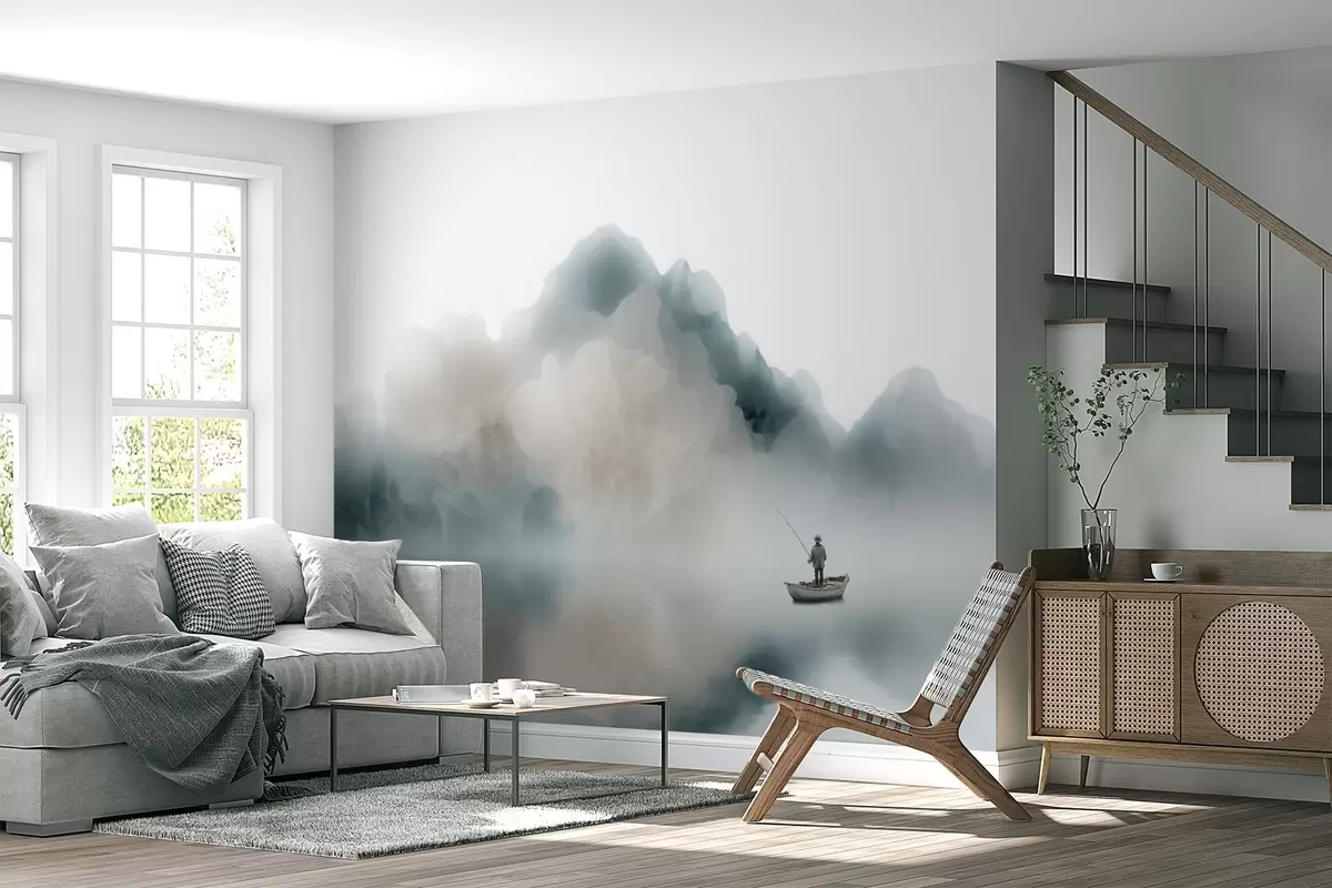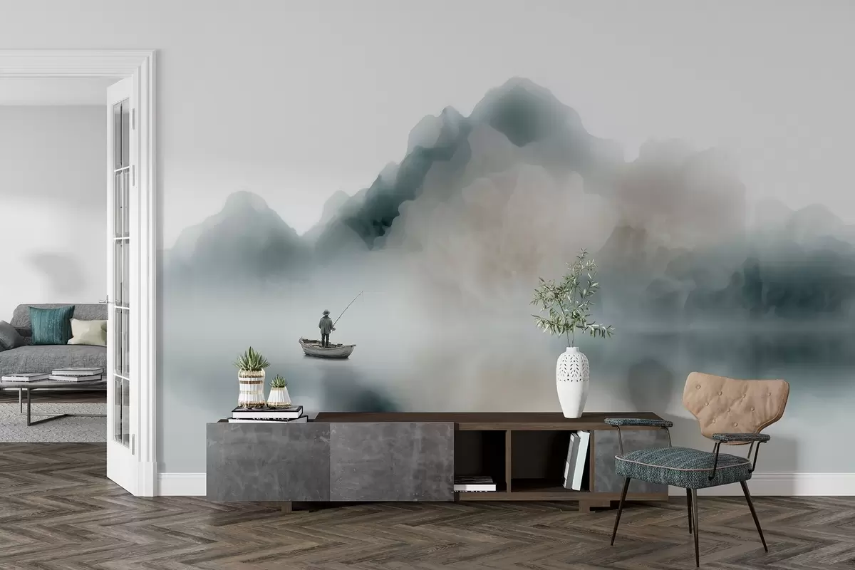 Fotomurales Paisaje montañoso con un barco y un pescador que se desvanecen en una suave niebla Nr. w09678
