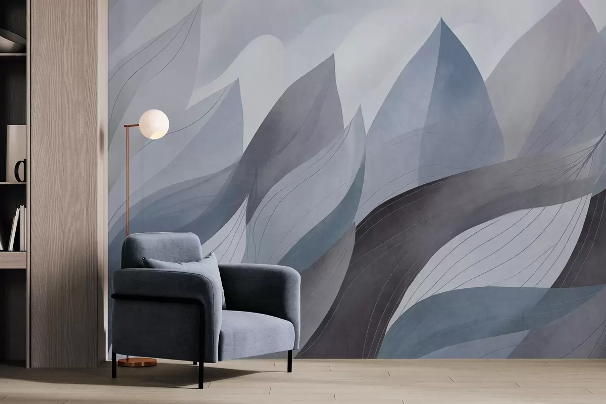 Fotomurales Hojas abstractas, tonos tierra apagados en azul con delicados detalles lineales, textura suave de acuarela. Nr. w09736v1