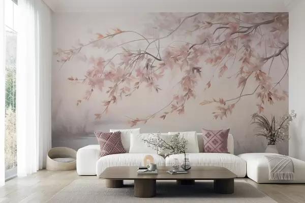 Fotomurales Paisaje texturizado con rama de cerezo en flor, hojas rosadas y fondo suave y brumoso. Nr. w09743