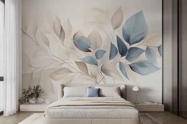 Fotomurales Hojas abstractas translúcidas en tonos azul, beige y crema, arte texturizado. Nr. w09744
