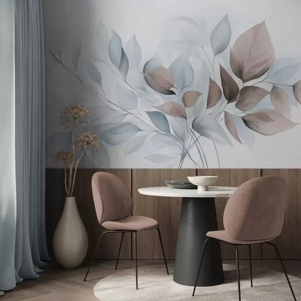 Fotomurales Hojas abstractas translúcidas en tonos azules, beige y marrones, arte texturizado. Nr. w09744v1