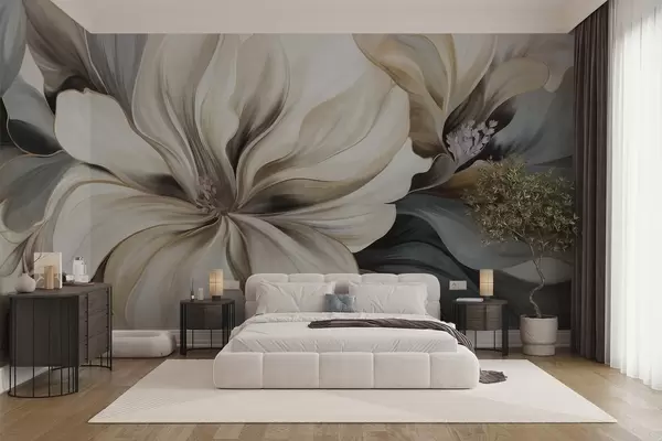 Fotomurales Grandes flores cremosas de magnolia con hojas marrones y grises, iluminación suave, fondo abstracto. Nr. w09749