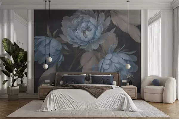 murales de pared Flores de peonía azul claro con textura y hojas de color beige sobre un fondo oscuro w09751