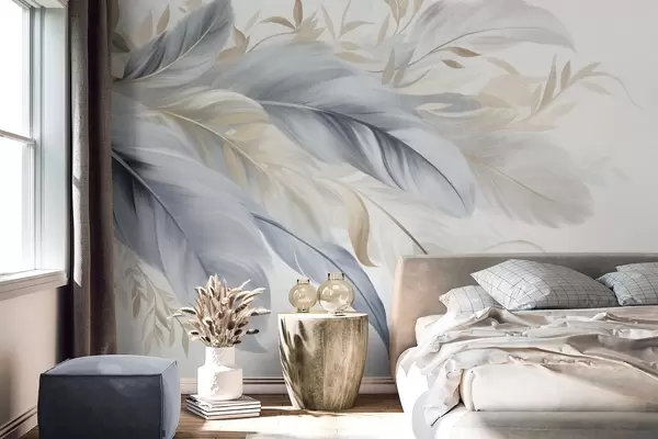 Fotomurales Plumas con textura en tonos pastel y delicadas hojas sobre un fondo claro Nr. w09763