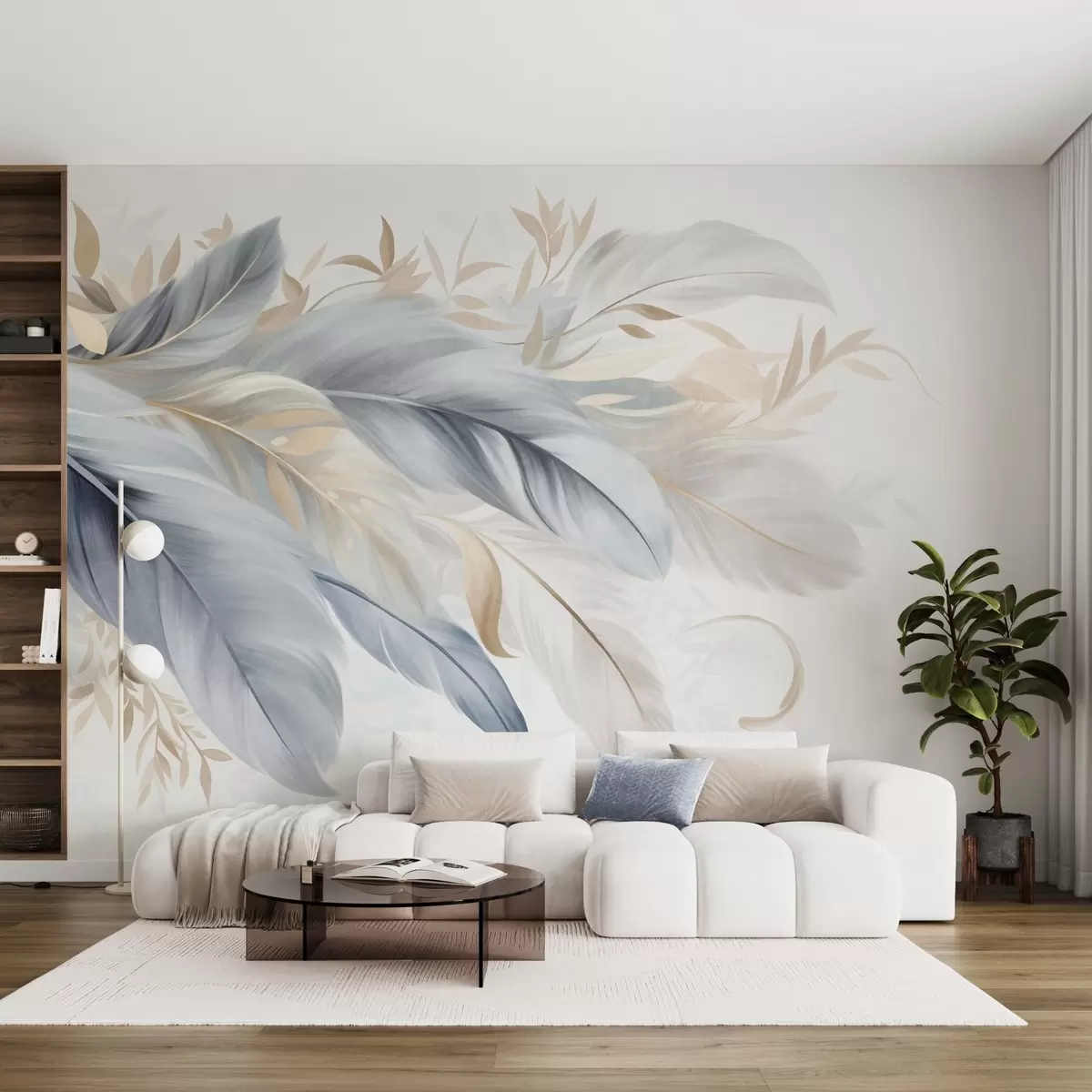 Fotomurales Plumas con textura en tonos pastel y delicadas hojas sobre un fondo claro Nr. w09763