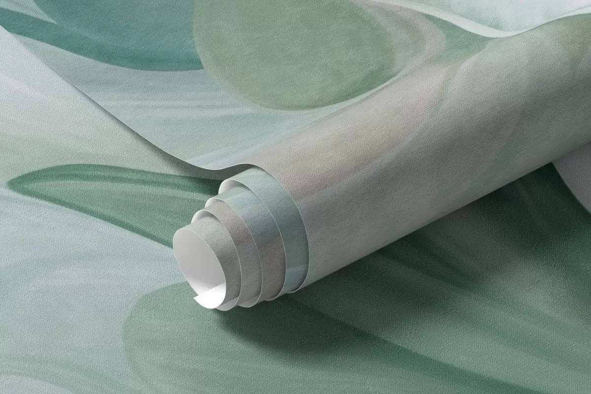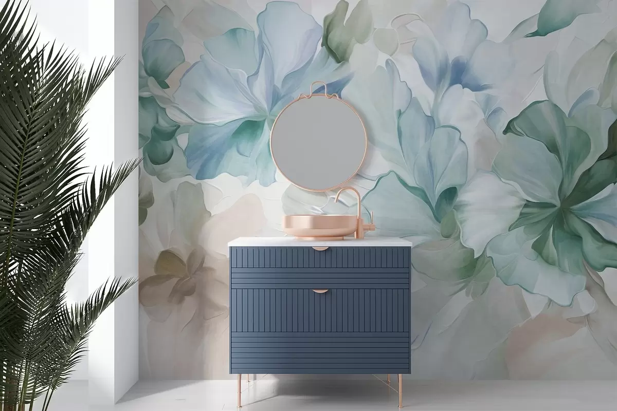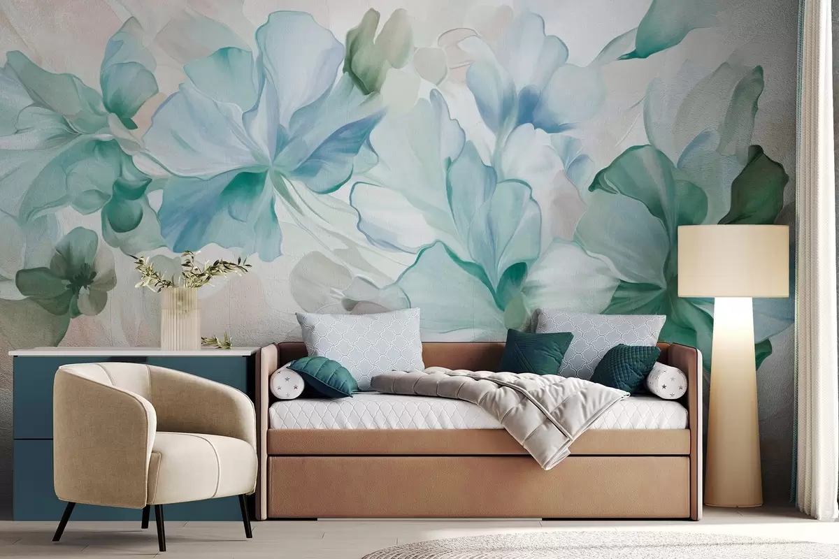 Fotomurales Flores abstractas de fantasía en tonos verdes, azules y beige, con un estilo pictórico y texturizado Nr. w09767v1