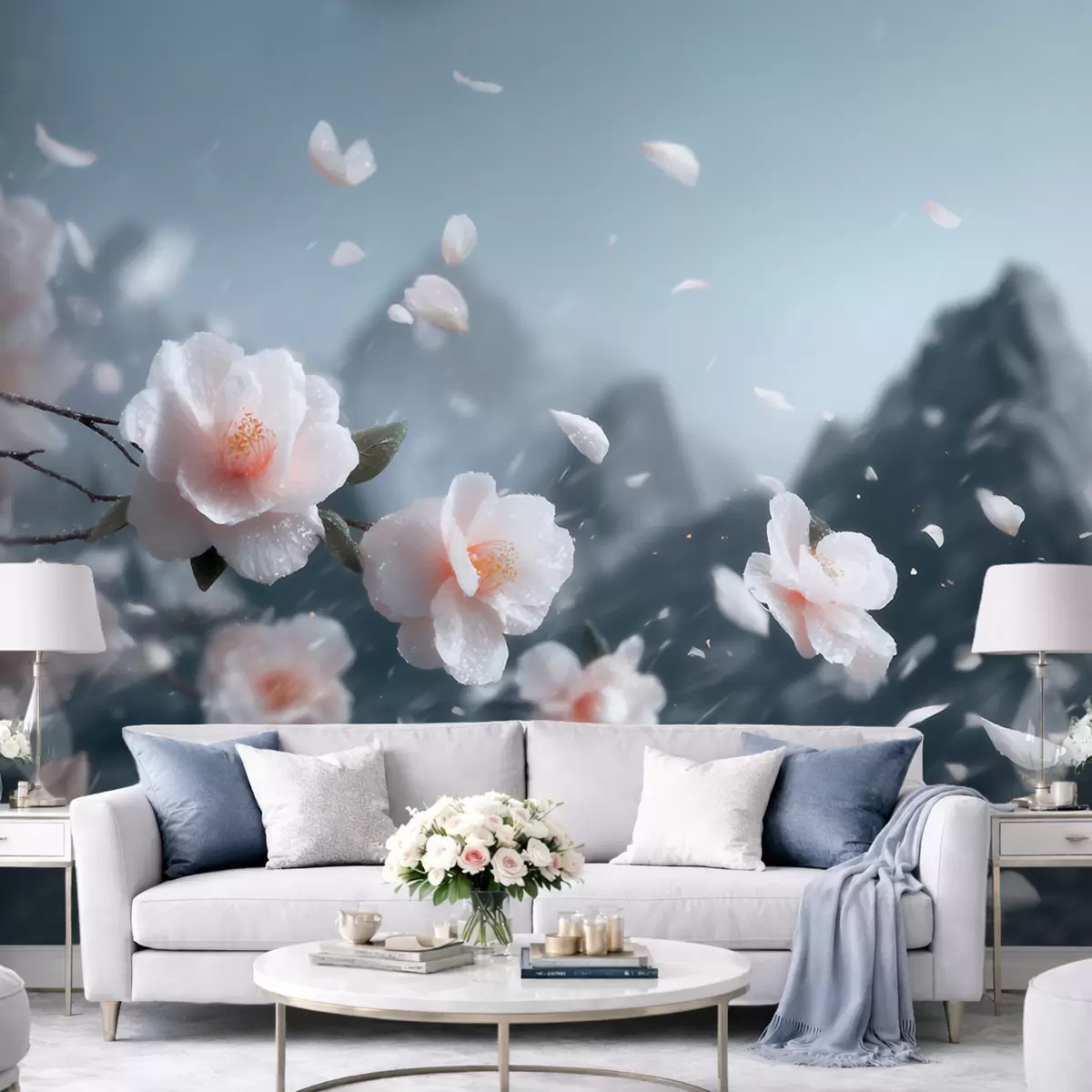 Fotomurales Delicadas flores de cerezo con las montañas de fondo; evocador paisaje japonés en tonos pastel Nr. w09808
