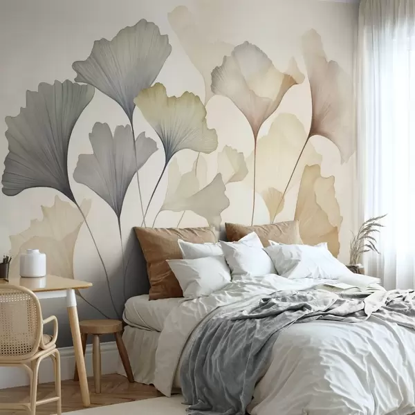 Fotomurales Hoja de ginkgo abstracta en tonos pastel apagados, como el azul, el verde y el melocotón; obra de arte con textura Nr. w09810