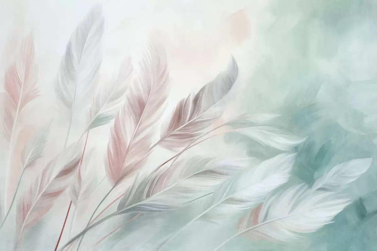 Fotomurales Plumas en tonos pastel con textura y bordes suaves y difuminados, sobre un fondo de estilo acuarela Nr. w09833v1