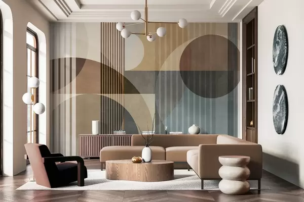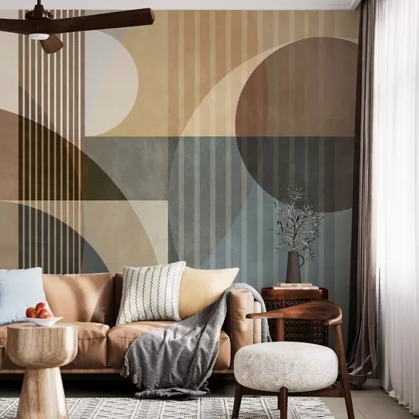 Fotomurales Formas geométricas abstractas con círculos y líneas, tonos tierra apagados, composición con texturas y capas Nr. w09834