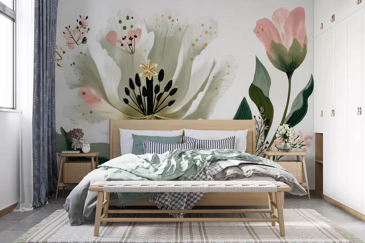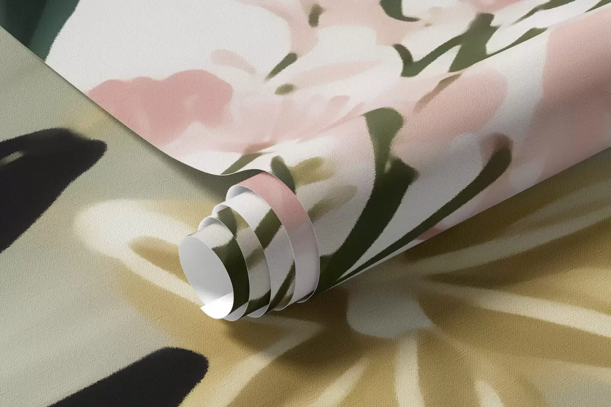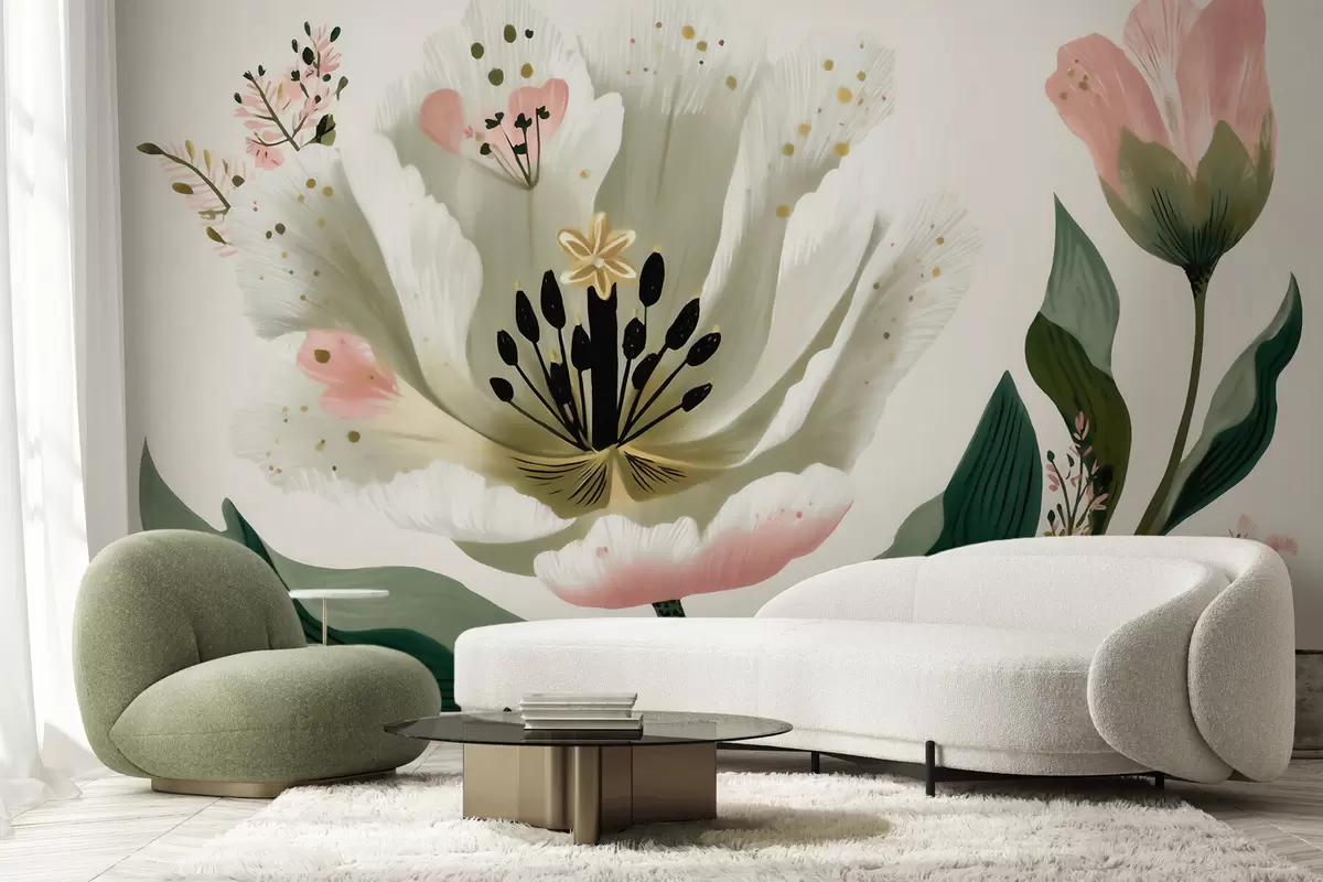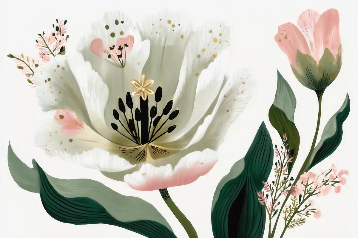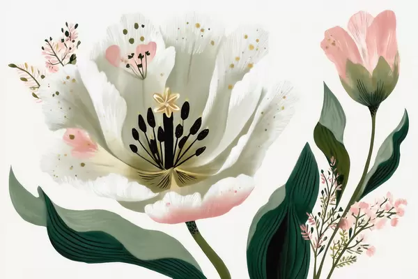 Fotomurales Una flor con hojas verdes y toques de color rosa pálido en estilo acuarela Nr. w09836