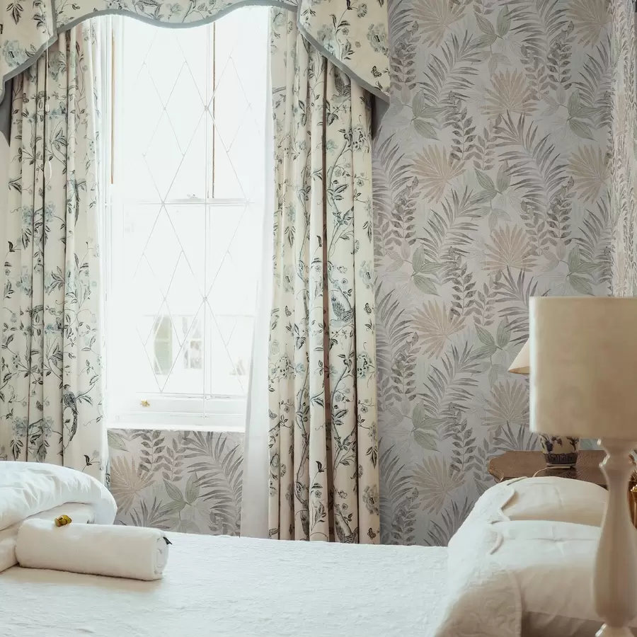 Hojas tropicales en tonos pastel sobre un fondo claro, textura sutil