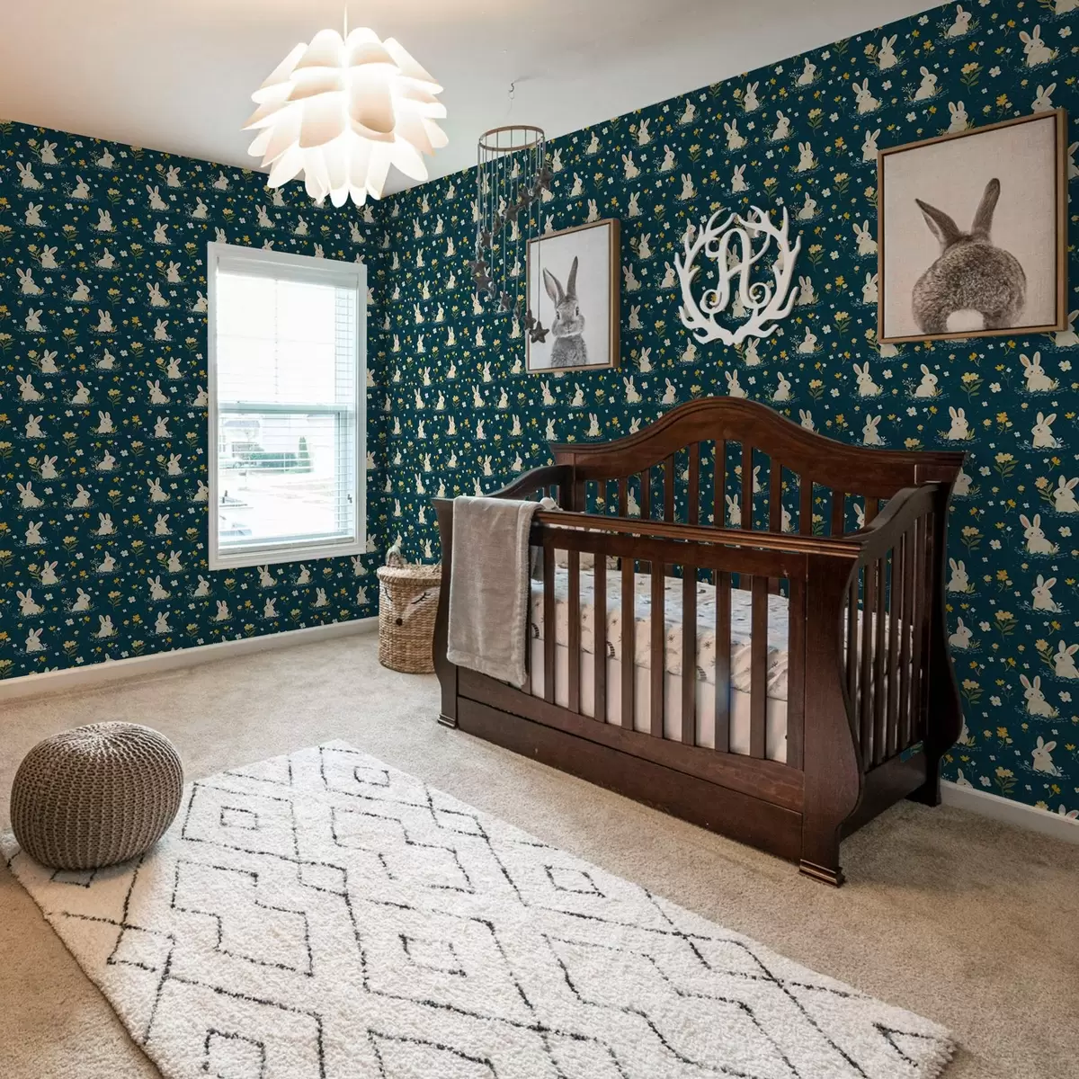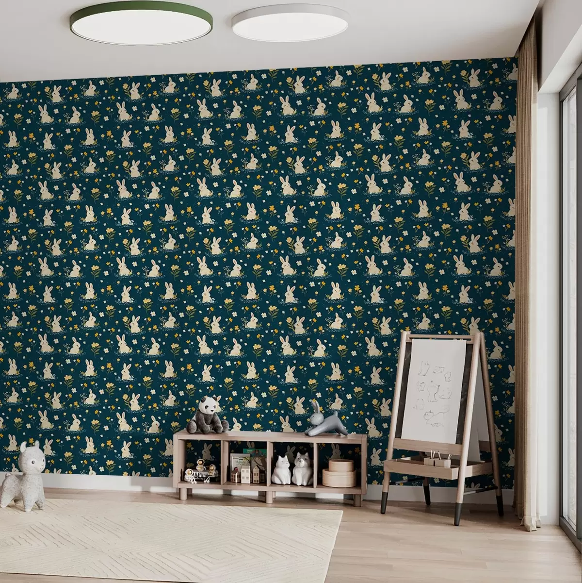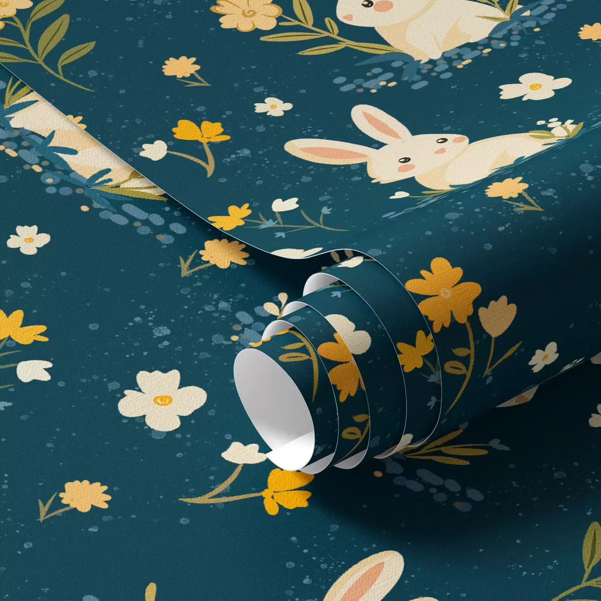Papel pintado Conejos en hierba y flores sobre fondo oscuro Nr. a00080