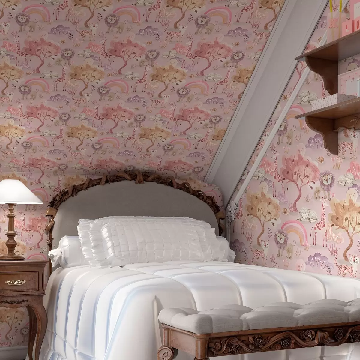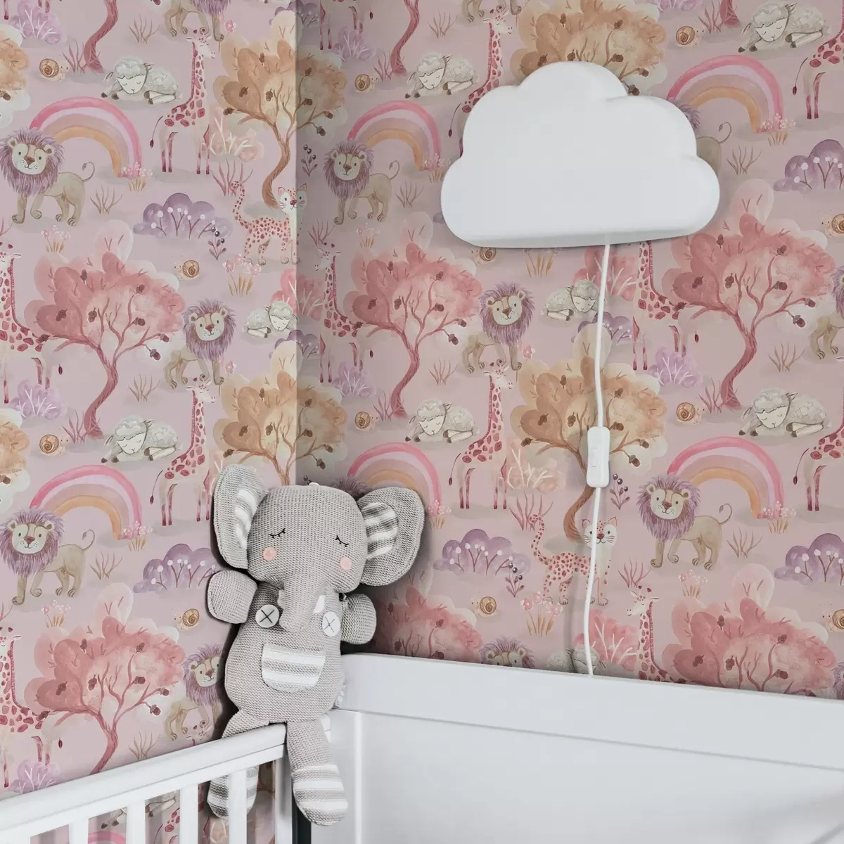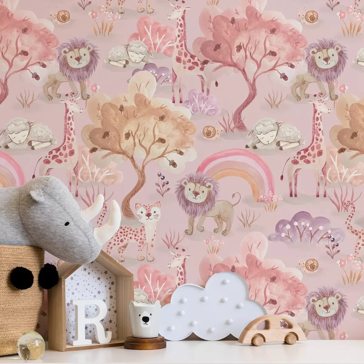 Papel pintado Cachorros de león, jirafas y arco iris en un bosque de colores pastel Nr. a00112