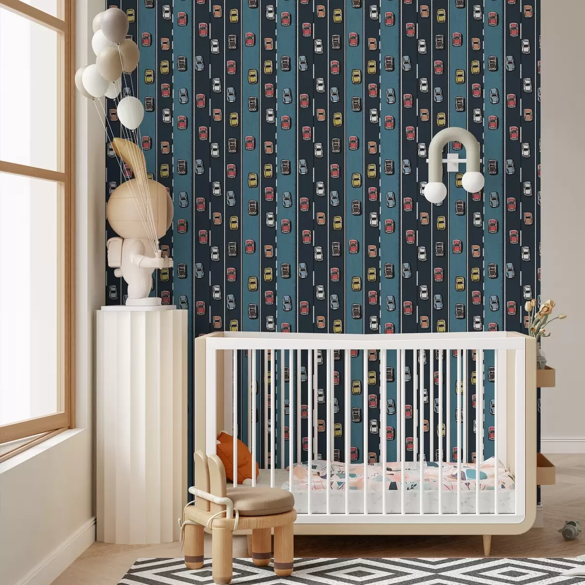 Papel pintado Coche retro en carretera azul marino al estilo de los años 60 Nr. a00118