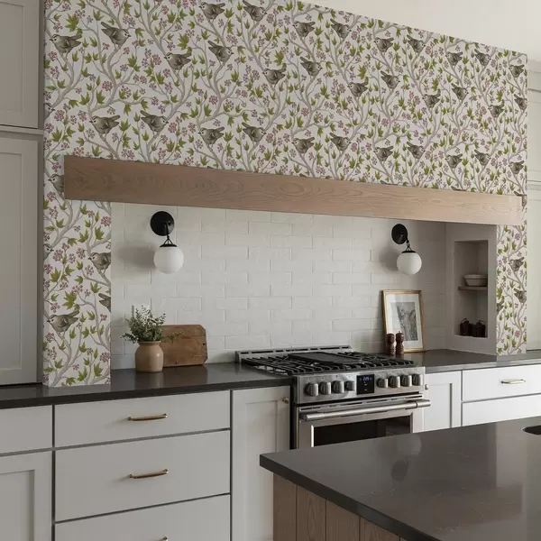 Papel pintado Pájaros sobre ramas con hojas y bayas sobre fondo blanco Nr. a00283