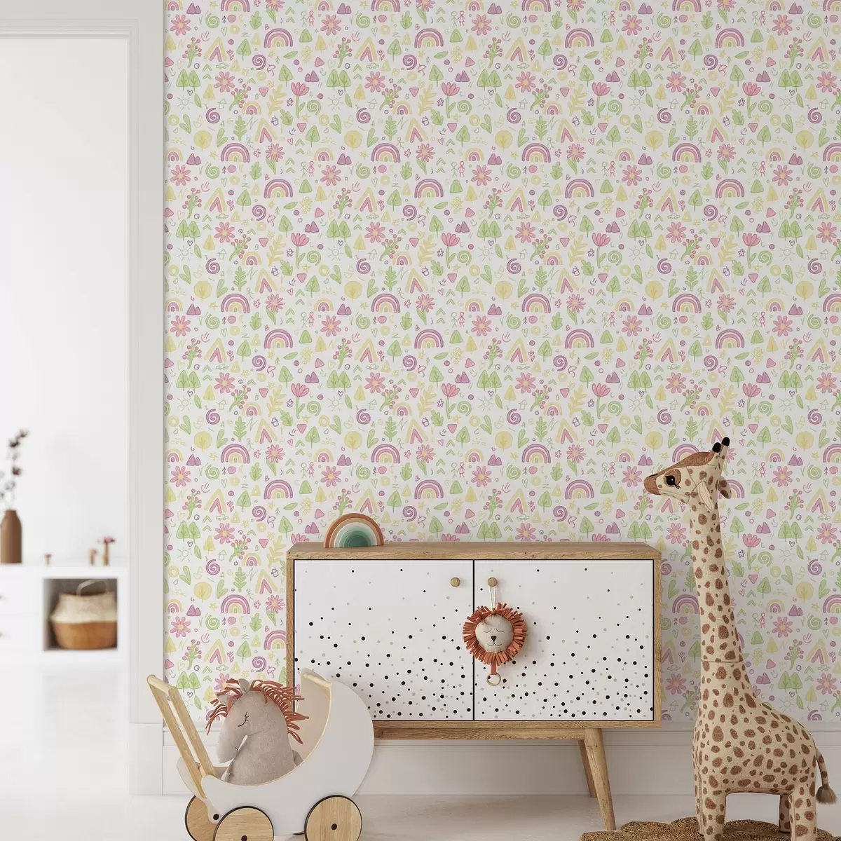 Papel pintado Dibujo infantil con arco iris, flores y árboles Nr. a00296