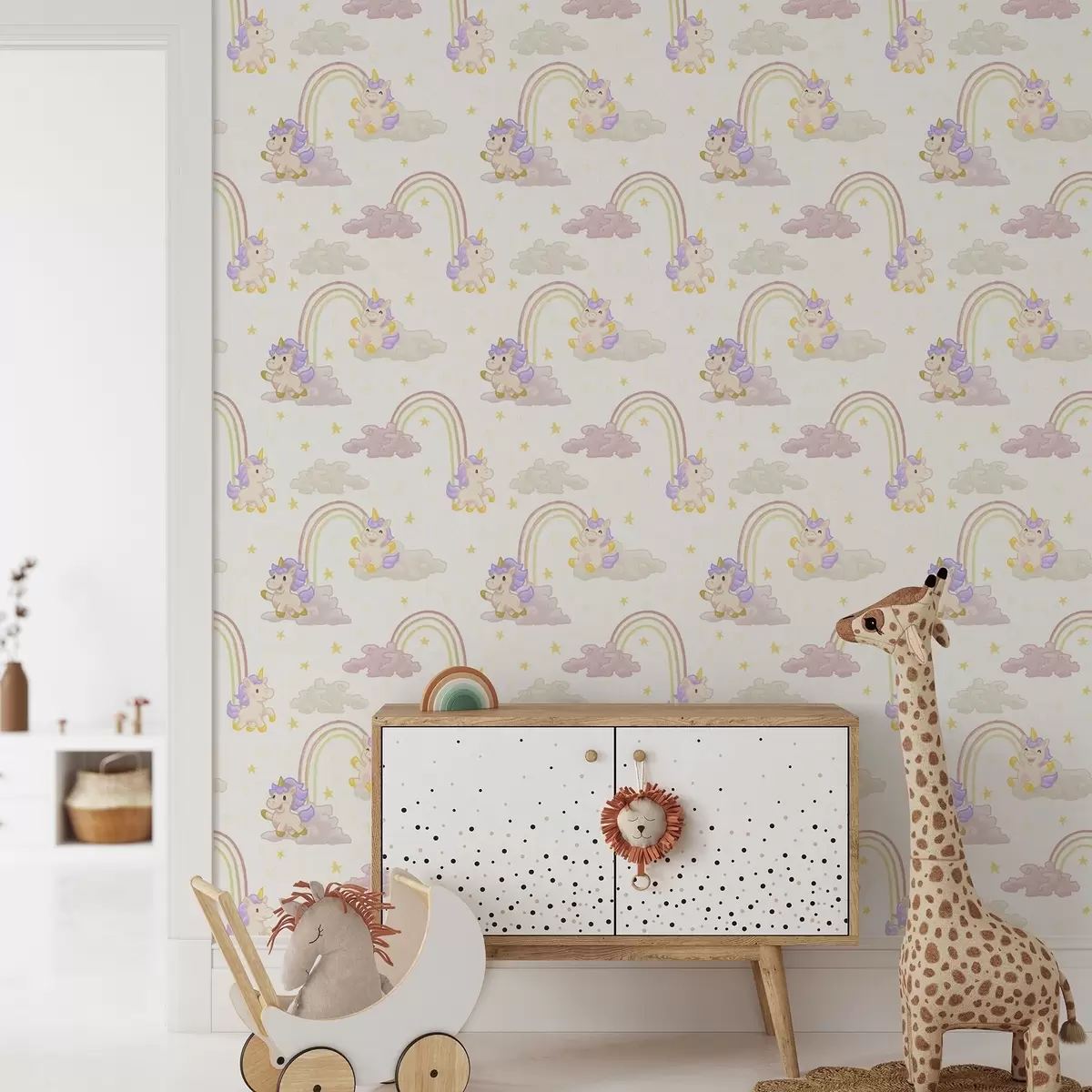 Papel pintado Bonito unicornio con arco iris y estrellas Nr. a00339