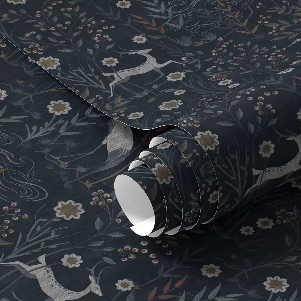 Papel pintado Fondo oscuro con pájaros y ciervos blancos Nr. a00363