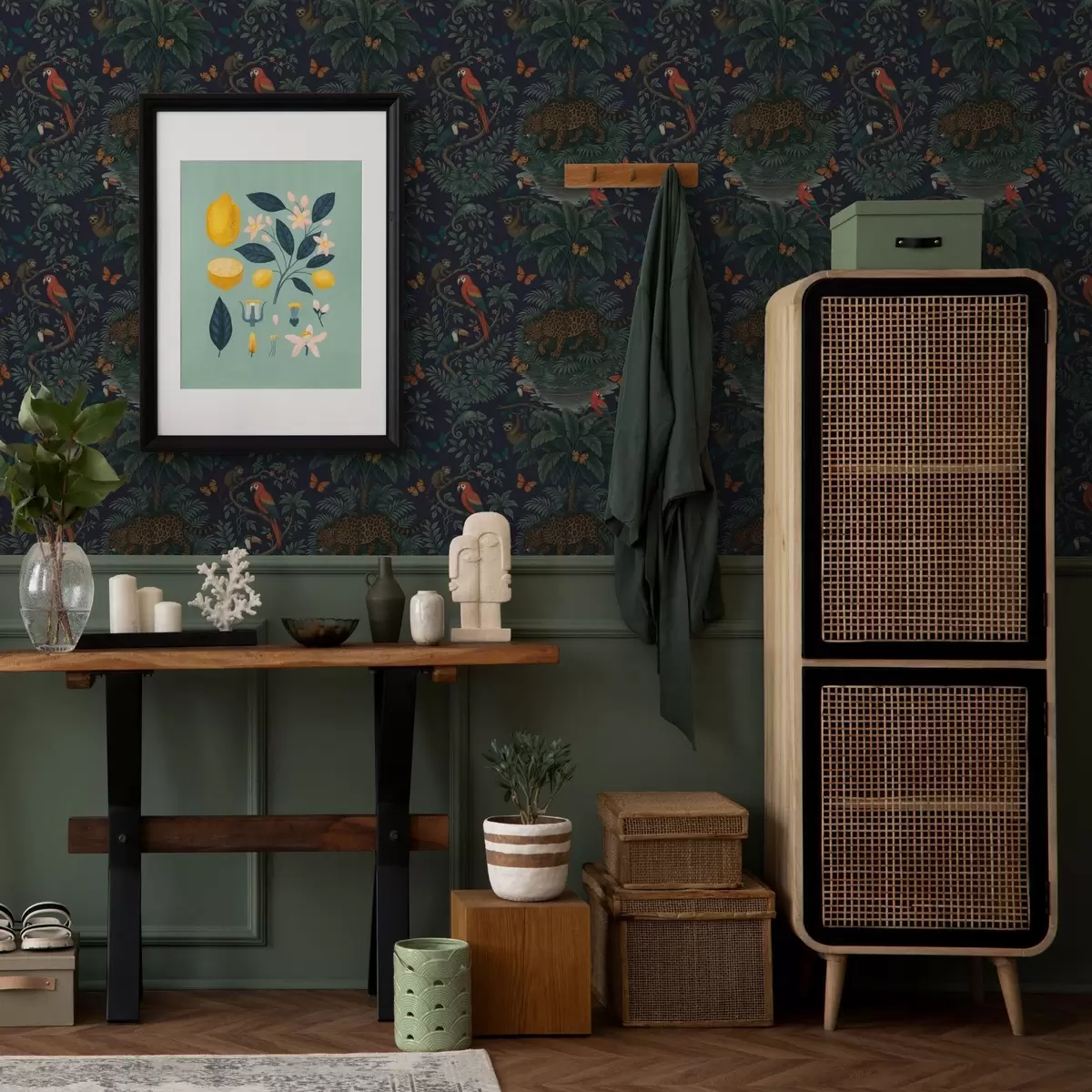 Papel pintado Selva tropical con leopardo, leopardo, loros y mariposas Nr. a00388