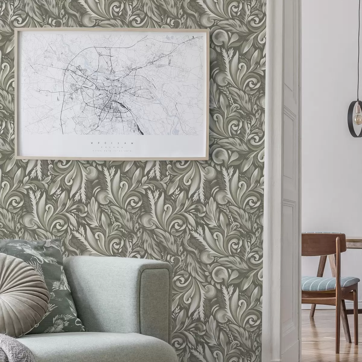 Papel pintado Volutas de acanto en una paleta de colores beige oliva Nr. a00501