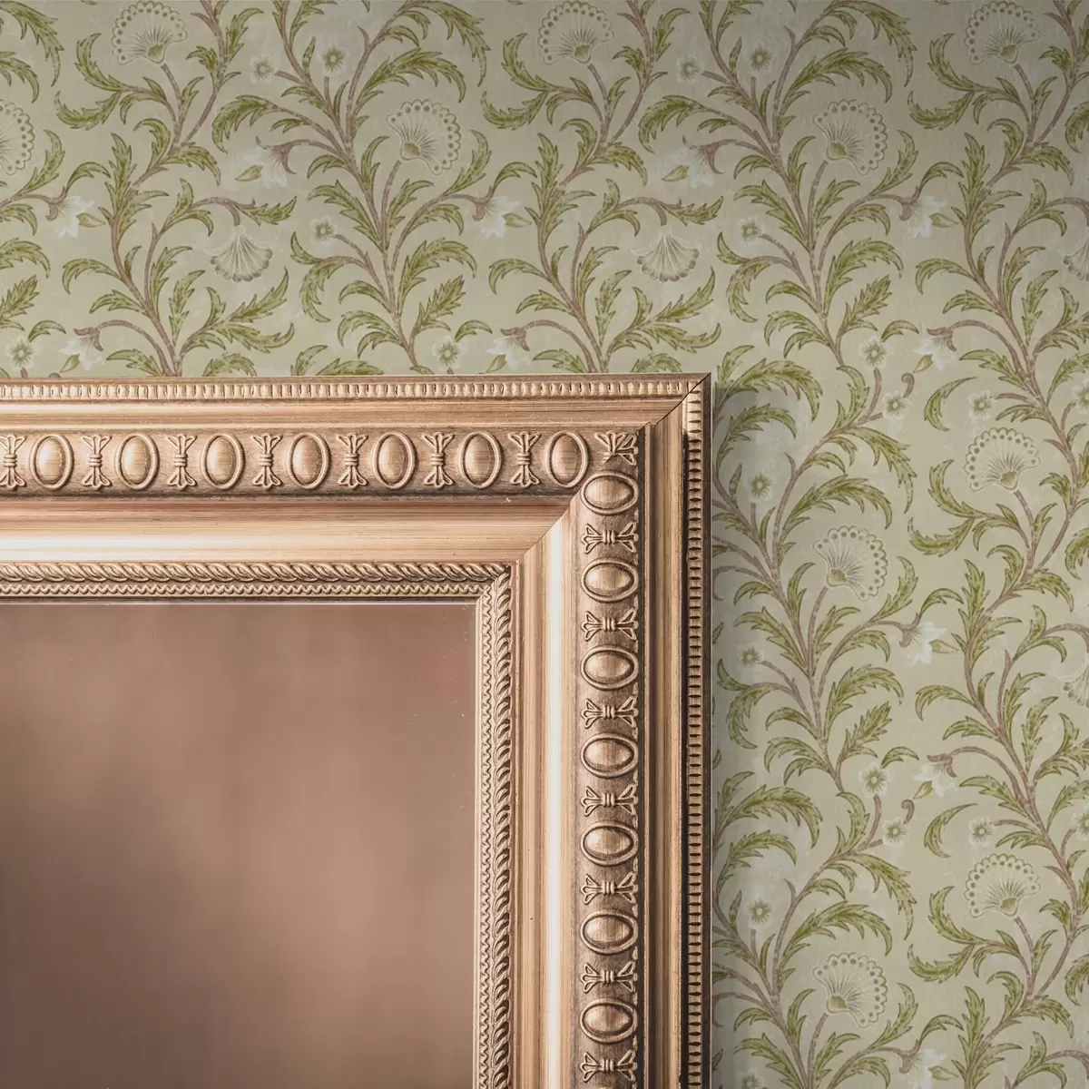 Papel pintado Adorno vintage con volutas y flores, beige y oliva Nr. a00574