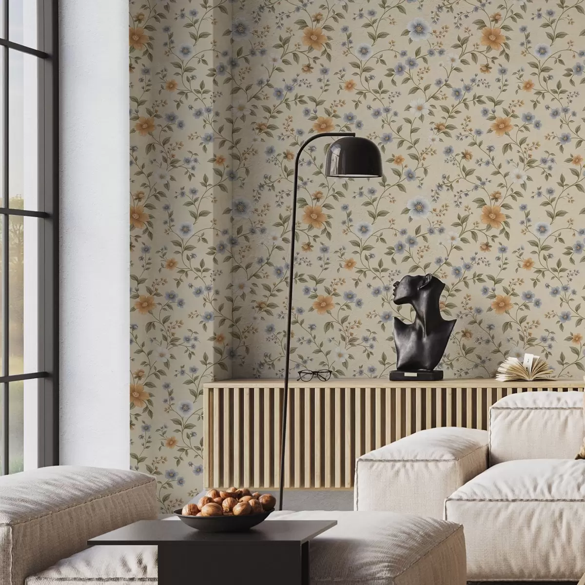 Papel pintado Ramas florales con flores azules y melocotón Nr. a00575