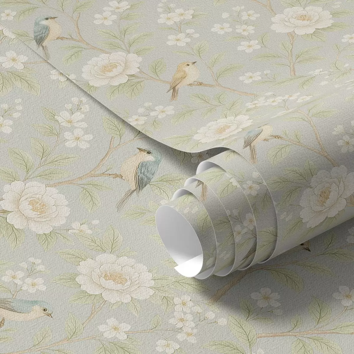 Papel pintado Pájaros entre flores blancas sobre un fondo gris verdoso Nr. a00583