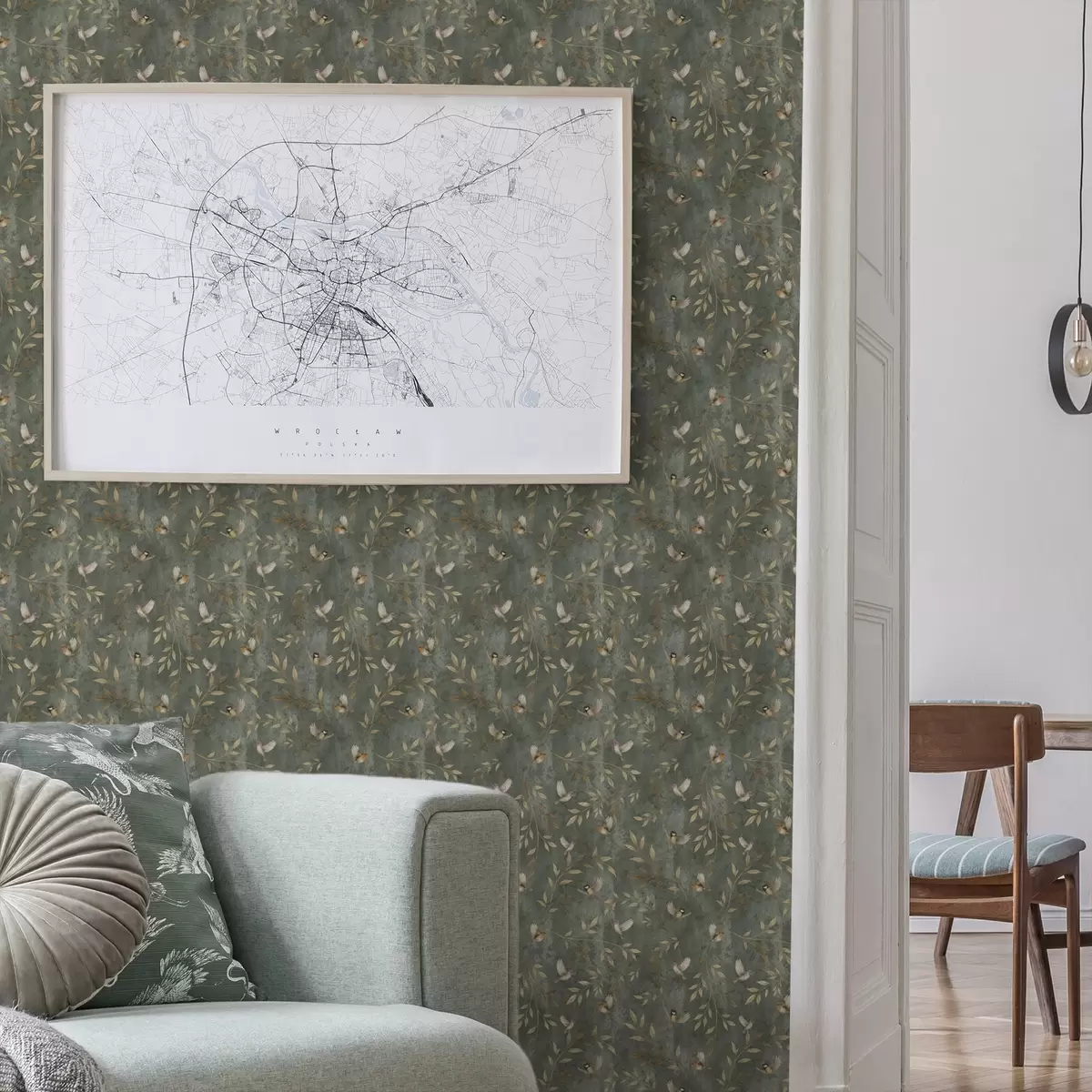 Papel pintado Pájaros entre follaje naranja sobre un fondo verde intenso Nr. a00591