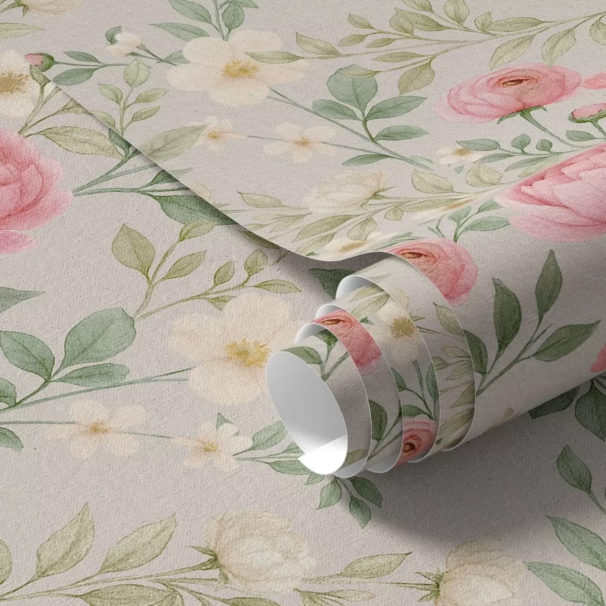 Papel pintado Peonías y flores blancas en acuarela sobre fondo gris-beige Nr. a00592