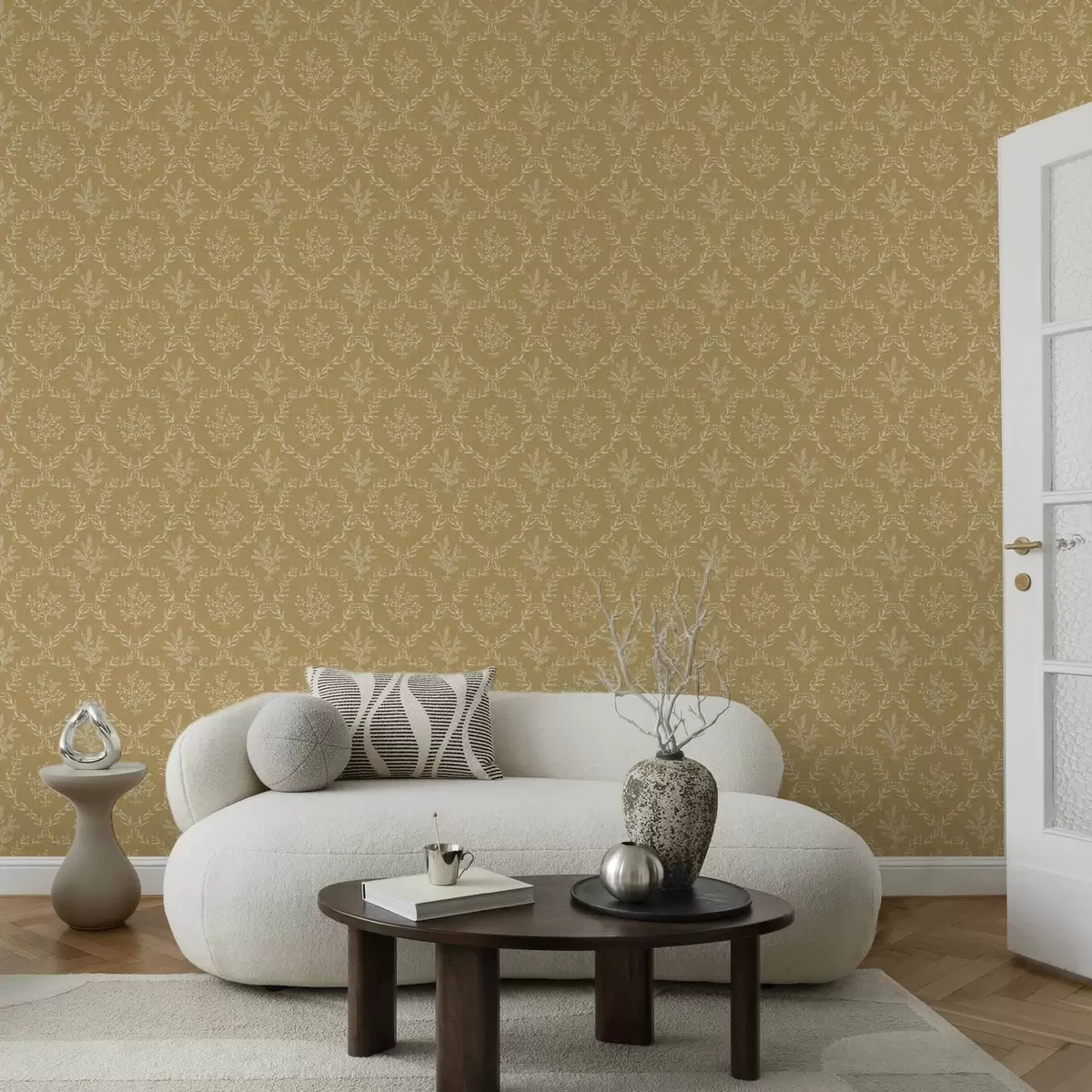 Papel pintado Coronas blancas de hierbas y flores sobre fondo mostaza Nr. a00599