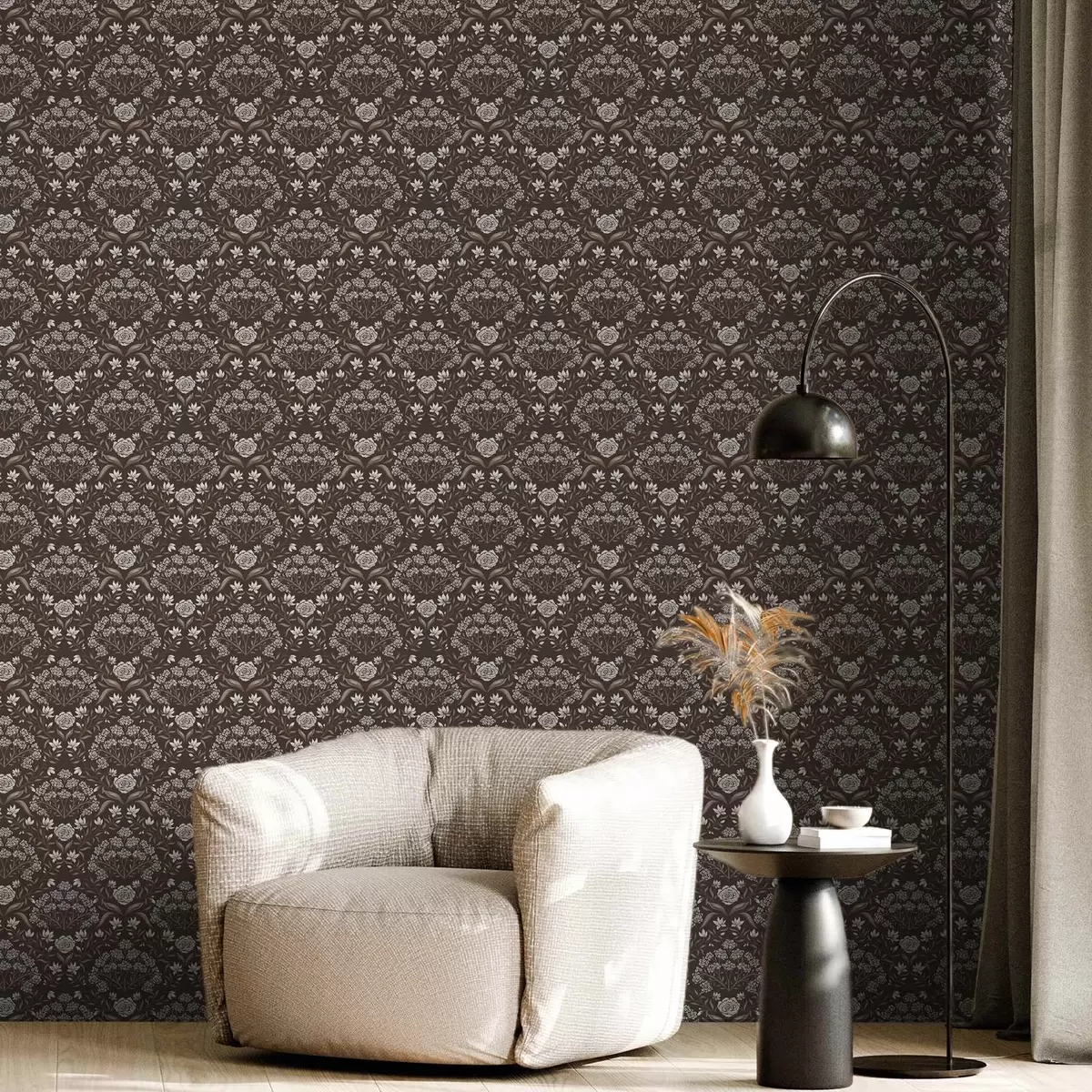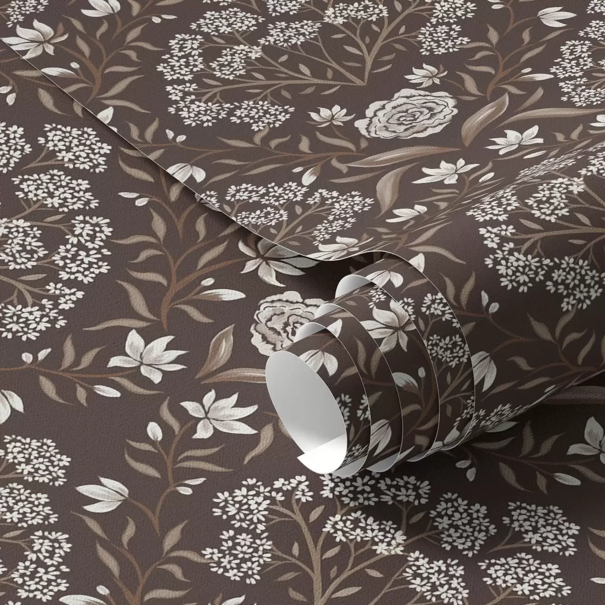 Papel pintado Damasco de chocolate negro con peonías y campanillas de invierno Nr. a00603v2