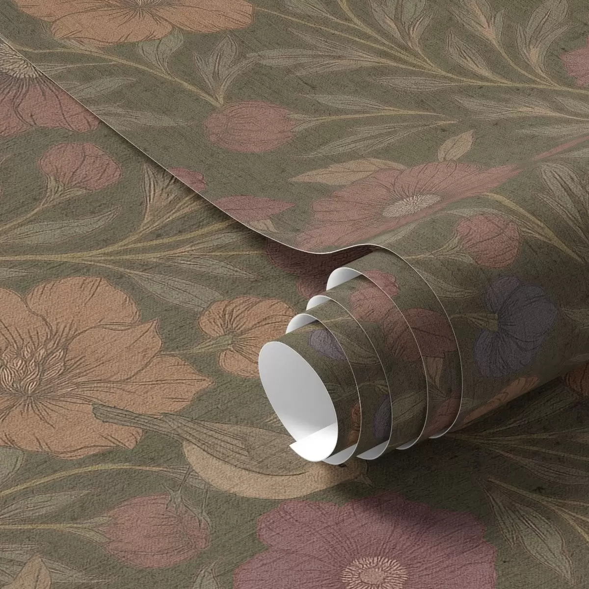 Papel pintado Flores otoñales y pájaros sobre fondo marrón oliva Nr. a00605