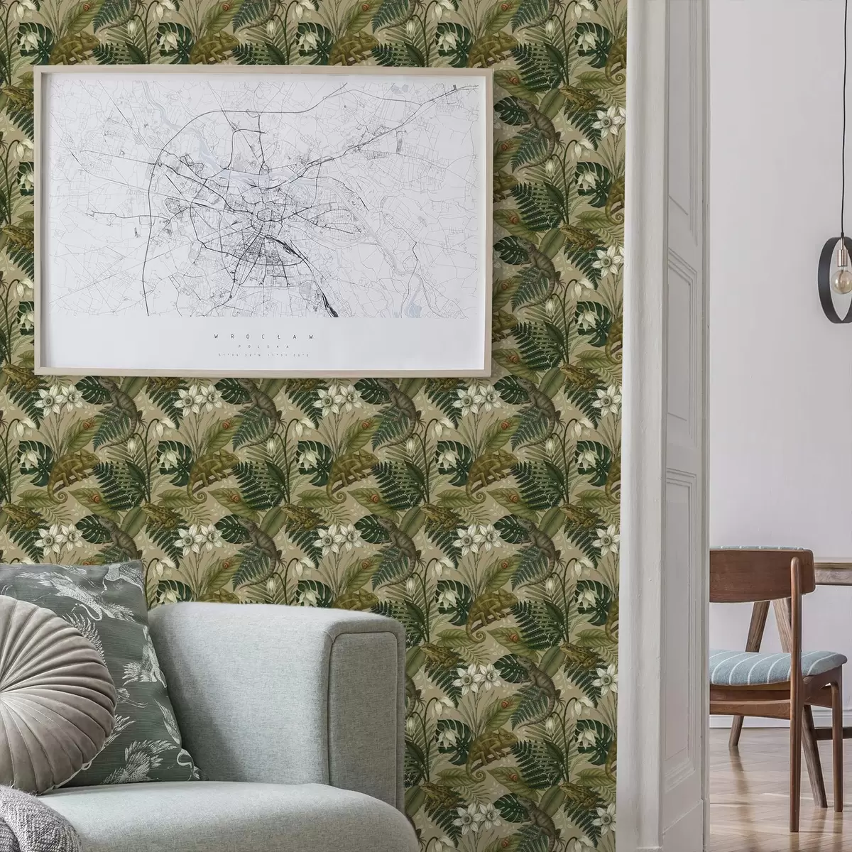 Papel pintado Camaleones y hojas tropicales, flores blancas, fondo beige Nr. a00608