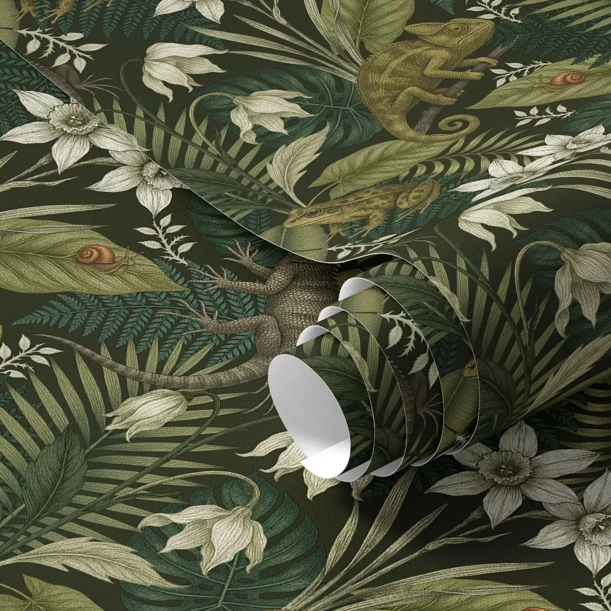 Papel pintado Camaleones y hojas tropicales, flores blancas, fondo oscuro Nr. a00608v1
