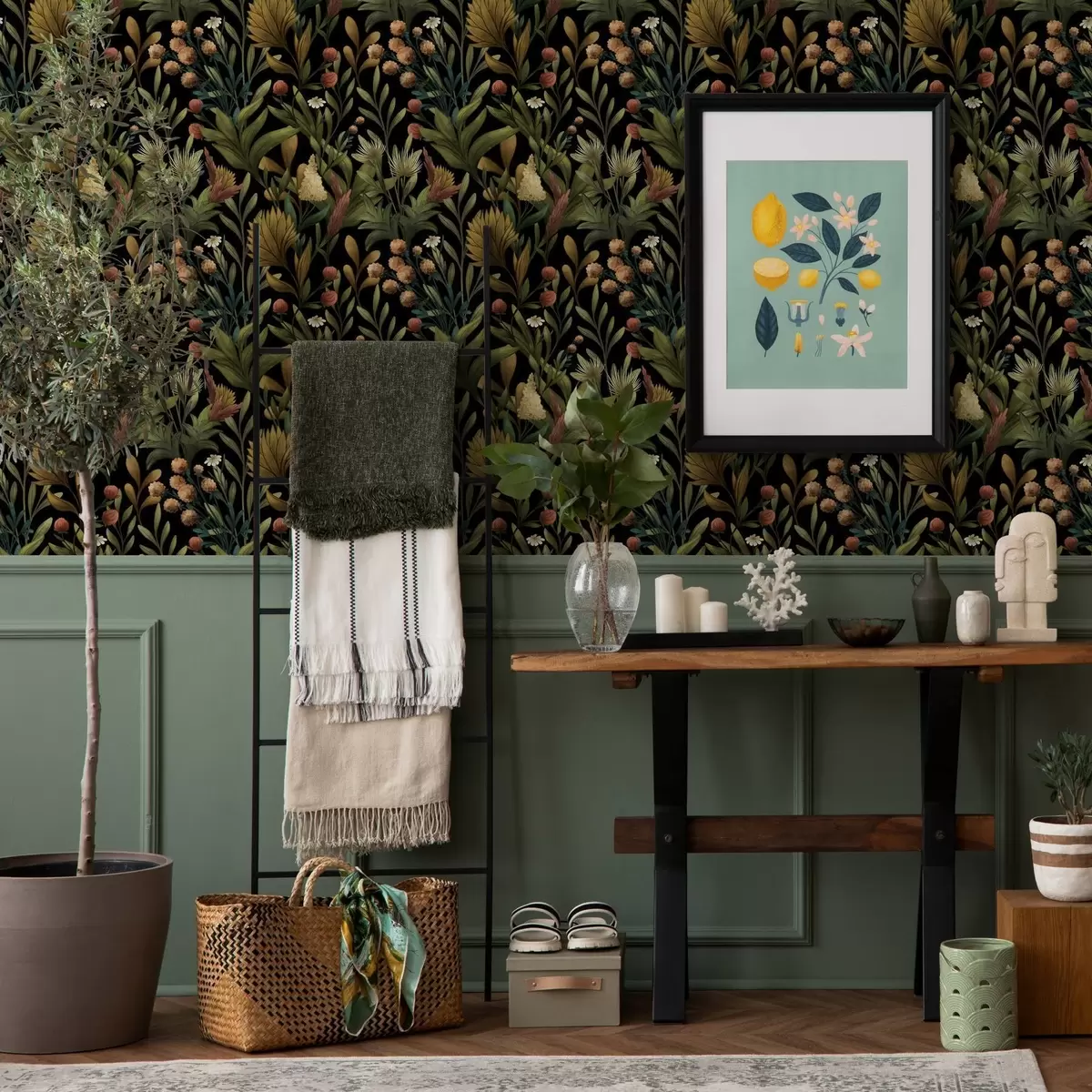Papel pintado Jardín botánico sobre fondo negro, cálida paleta otoñal Nr. a00619