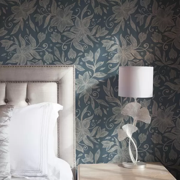 Papel pintado Flores lineales color crema sobre fondo azul, delicados arabescos Nr. a00630