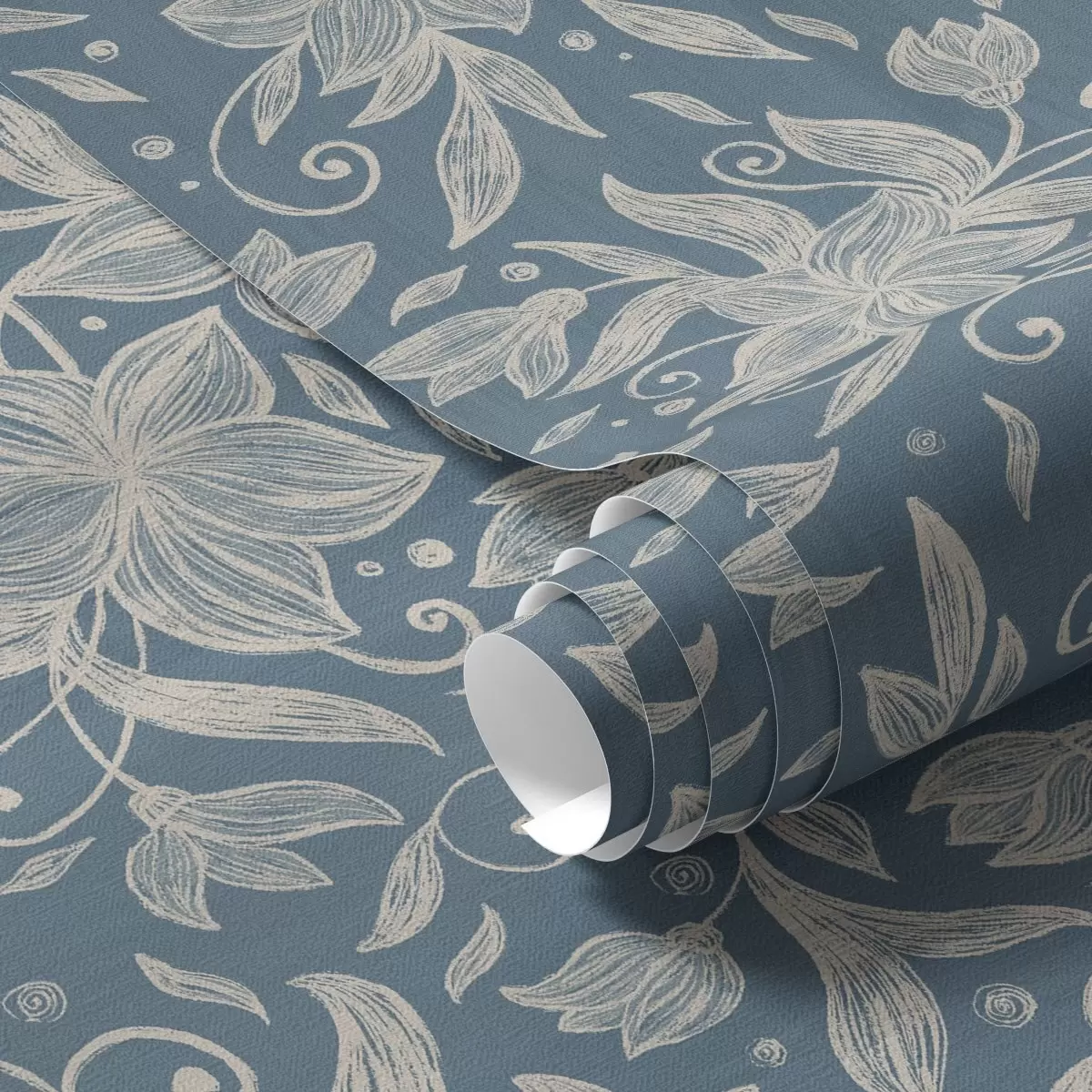 Papel pintado Flores lineales color crema sobre fondo azul, delicados arabescos Nr. a00630
