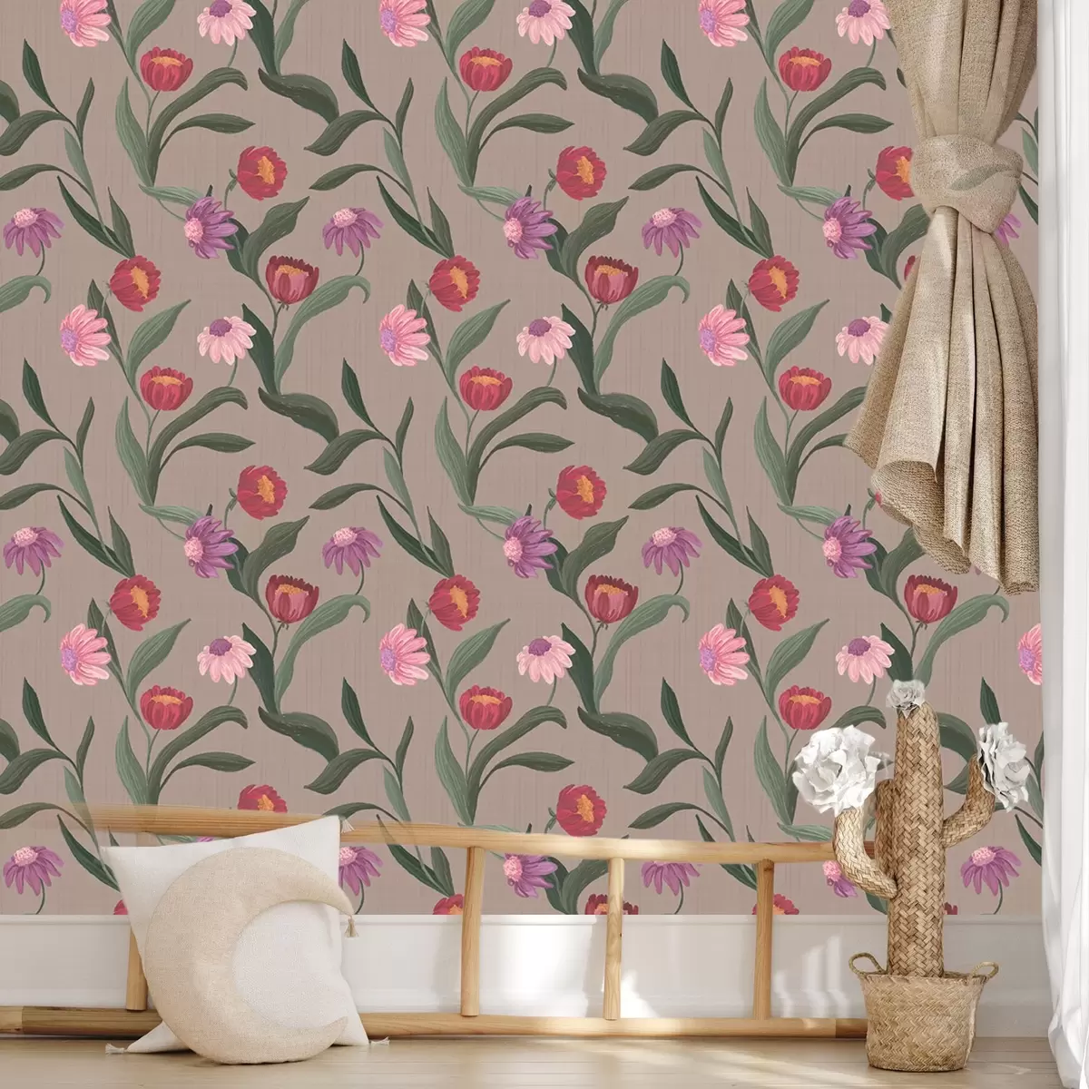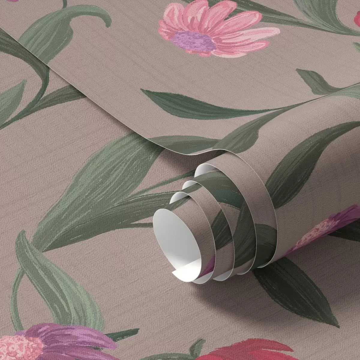 Papel pintado Flores de color rosa rojizo sobre fondo gris pardo, tallos largos Nr. a00631v2