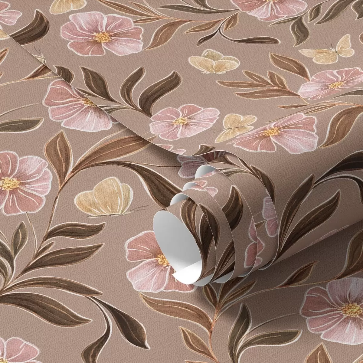 Papel pintado Flores rosas y mariposas sobre un cálido fondo marrón Nr. a00633v1