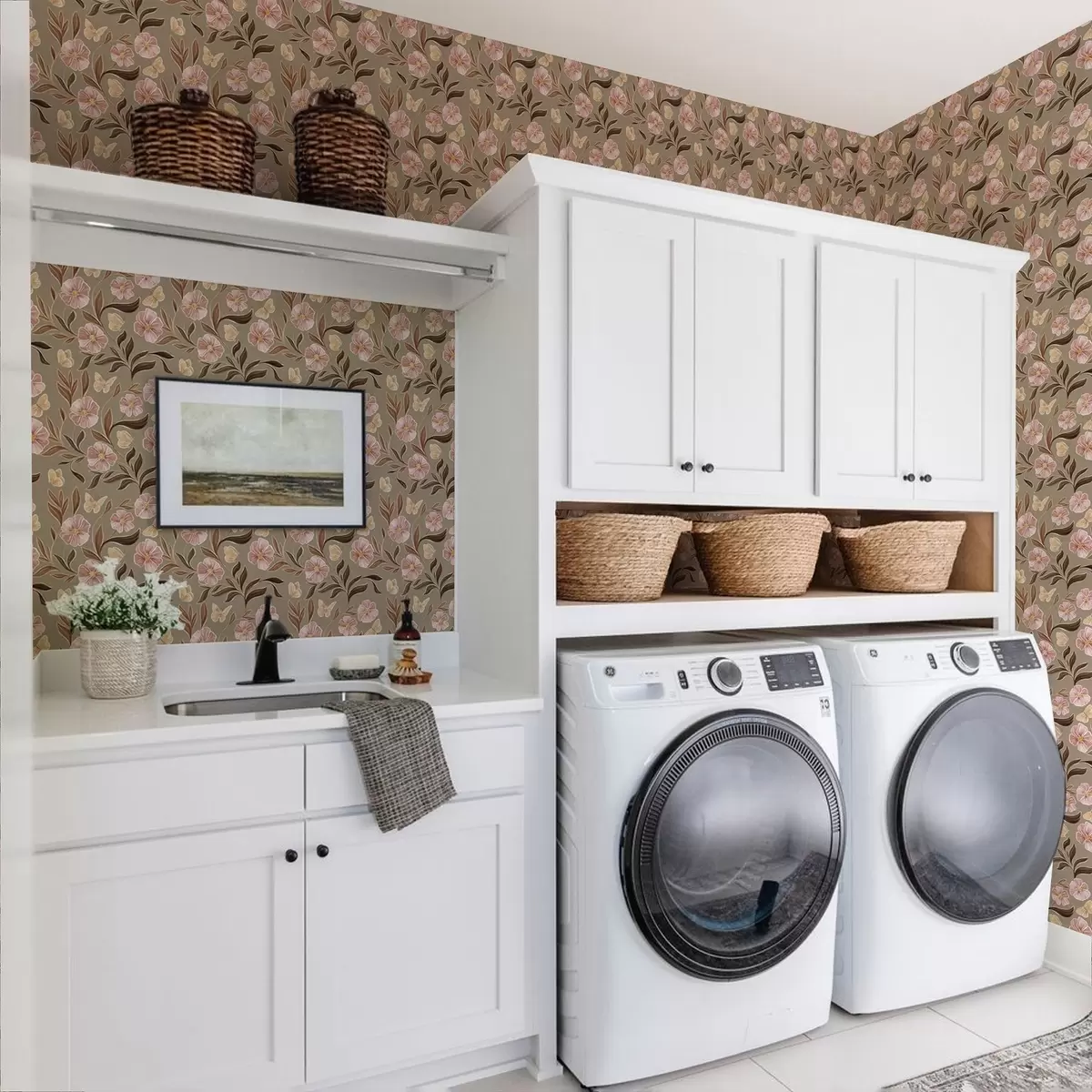 Papel pintado Flores rosas y mariposas sobre fondo beige oliva Nr. a00633v2