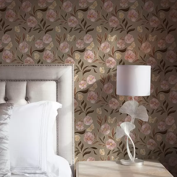 Papel pintado Flores rosas y mariposas sobre fondo beige oliva Nr. a00633v2