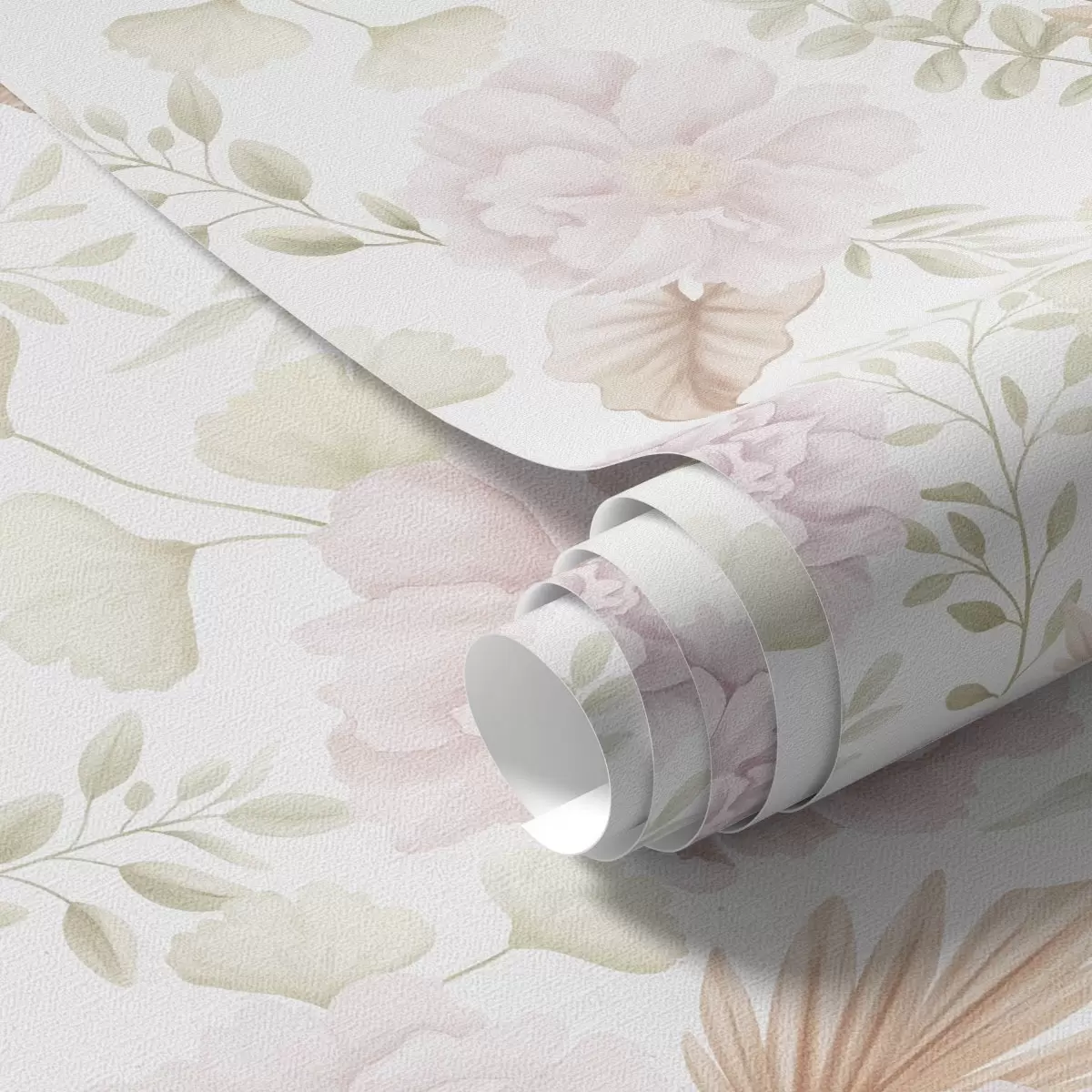 Papel pintado Suaves peonías en tonos pastel y follaje sobre fondo blanco Nr. a00669
