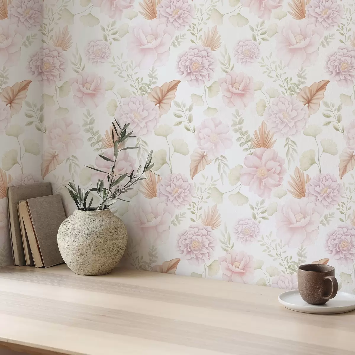 Papel pintado Suaves peonías en tonos pastel y follaje sobre fondo blanco Nr. a00669