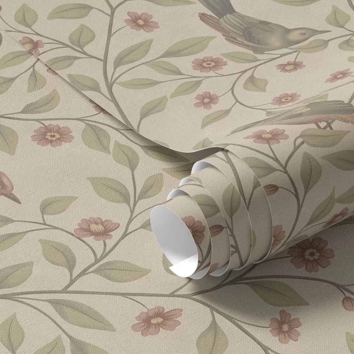 Papel pintado Pájaros en ramas florecidas, fondo beige cálido Nr. a00670