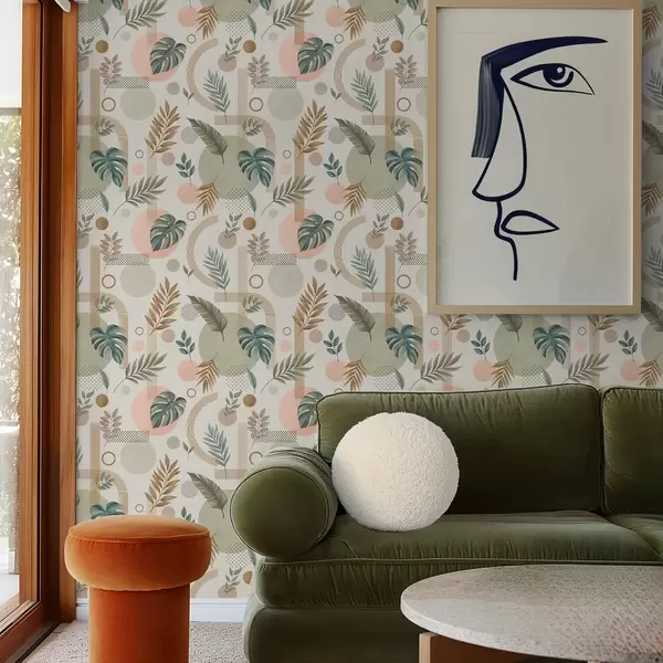 Papel pintado Hojas y formas geométricas en tonos cálidos y tranquilos a00677