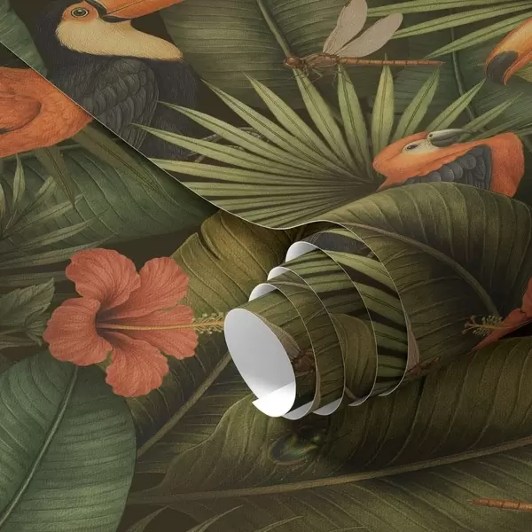 Papel pintado Tucanes y loros entre el follaje y las flores tropicales Nr. a00702