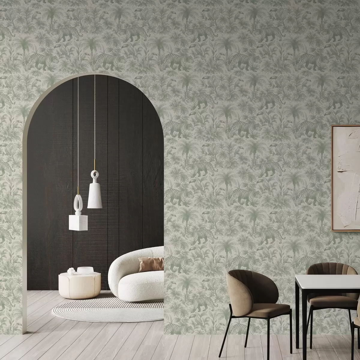 Papel pintado Tigres y aves tropicales entre palmeras sobre un fondo claro Nr. a00711