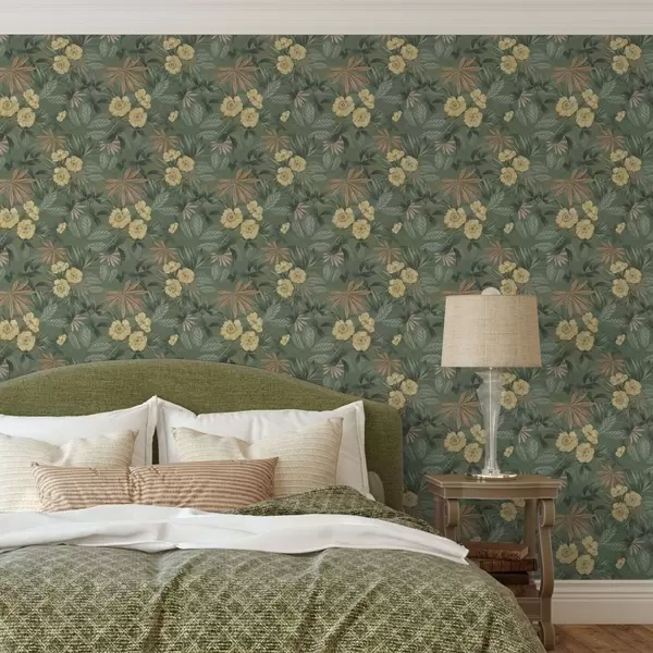 Papel pintado Flores amarillas entre texturas de hojas verdes Nr. a00718