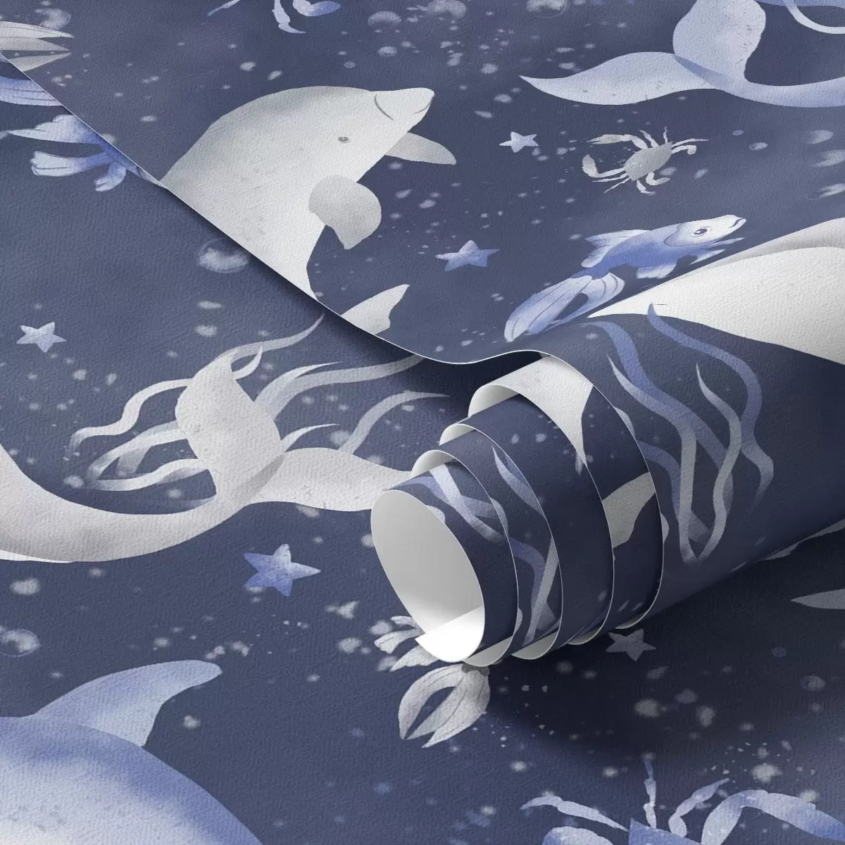 Papel pintado Ballenas marinas, delfines y cangrejos sobre un fondo azul oscuro Nr. a00720